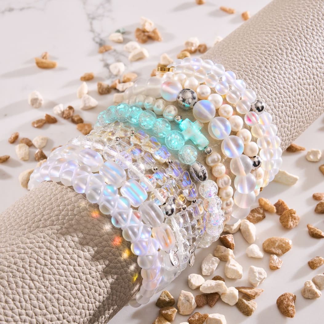 | | | | | VERSATILE STYLE Summer Whites is all about that clean, cool glow. Think crisp linens, sunlit mornings, and the kind of effortless shine that makes everything feel a little lighter. These bracelets bring a fresh pop of brightness to your stack—simple, radiant, and made to move with you from golden hour to after-dark | | | | DID YOU KNOW? White tones are known to evoke freshness, simplicity, and a sense of renewal. Inspired by sun-bleached linens, clear skies, and the ease of summer days, these shades bring a light, airy feel that adds effortless elegance to any look. | | | | | St. Amanda | .925 Sterling Silver | Alabaster Firefly Glass x Ivory Freshwater Pearl Cross Bracelet |